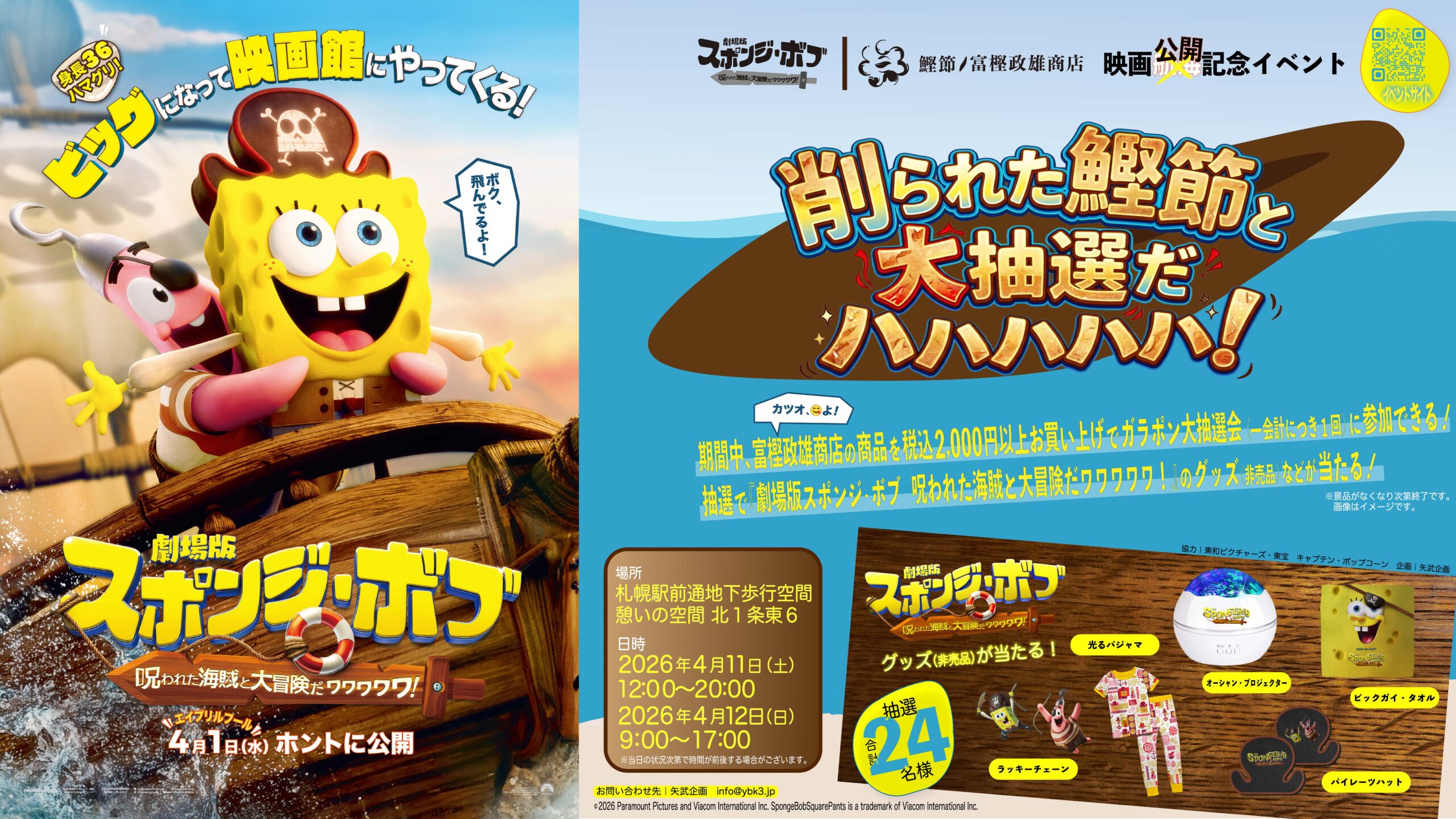 4月11日(土)、12日(日)に鰹節ノ富樫政雄商店は『劇場版スポンジ・ボブ 呪われた海賊と大冒険だワワワワワ!』の公開を記念して、映画公開記念イベント「削られた鰹節と大抽選だ ハハハハハ!」を札幌駅前通地下歩行空間(チ・カ・ホ)で開催致します。鰹節ノ富樫政雄商店の商品を合計2,000円(税込)以上お買い上げで映画グッズ(非売品)などが当たるガラポン大抽選会を実施します。